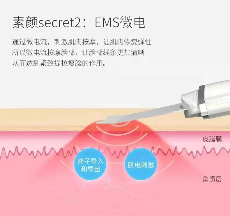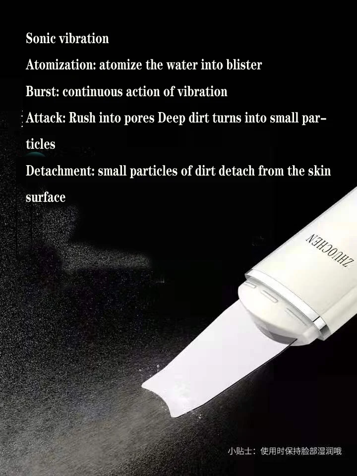 Sonic vibration Atomization: atomize the water into blister Burst: continuous action of vibration Attack: Rush into pores Deep dirt turns into small particles Detachment: small particles of dirt detach from the skin surface